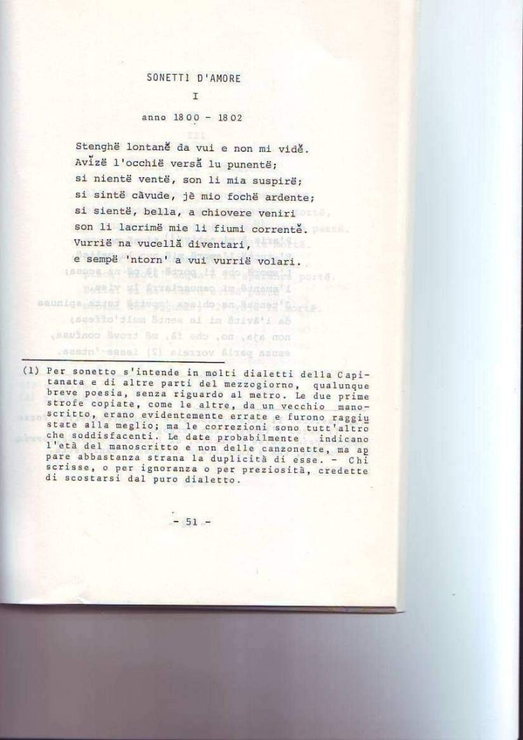 Nei casi di autore identificato come certo o probabile, è ragionevole pensare a un periodo di composizione esteso fra la seconda metà dell’Ottocento e i primi del Novecento. Ci troviamo di fronte a una fase antica della poesia dauna e ad autori non sappiamo se di raccolte o di versi sporadici. L’unico che, incluso da Marchianò, compaia anche in un altro repertorio (Sorrenti) è Filippo Bellizzi di Foggia; non solo, ma Sorrenti riporta lo stesso testo che troviamo in Marchianò, “N’or de notte (de vierne)”(Marchianò 1984: 7-10, Sorrenti 1962: 238-40. Le due versioni sembrerebbero attinte a fonti diverse, o manipolate dai curatori, perché presentano varianti (nella grafia e nella divisione in strofe). La versione Marchianò è data come stesura d’autore (tranne i versi 2-10, indicati come popolari), ed è definita canzonetta non popolare “ma popolareggiante composta da Filippo Bellizzi nel 1892” (postilla di Marchianò, p. 7). Un’altra composizione attribuita come probabile a F. Bellizzi si trova alle pp. 86-88, che riportano canti da San Marco in Lamis; a pag. xv l’anonimo prefatore del volume postumo di Marchianò dice: “La raccolta sammarchese si chiude con le Canzoni d’amore raccolte dal dialettologo foggiano F. Bellizzi, che le ha trascritte in maniera assai soddisfacente” (ma a dire il vero la trascrizione suona ben poco sammarchese).), bozzetto di paese con tipi di paese: campane, fruttivendoli, venditori ambulanti di scagliuzzi10. A fronte di tale mondo di Bellizzi, più vivace sembra quello della conterranea Elisa Giordano, attestato in un bozzetto a sfondo politico, “U suggialisto e la mugliera” (Marchianò 1984: 11), il cui argomento fa pensare, ma alla lontana e per contrario, al suo contemporaneo garganico Napolitano.