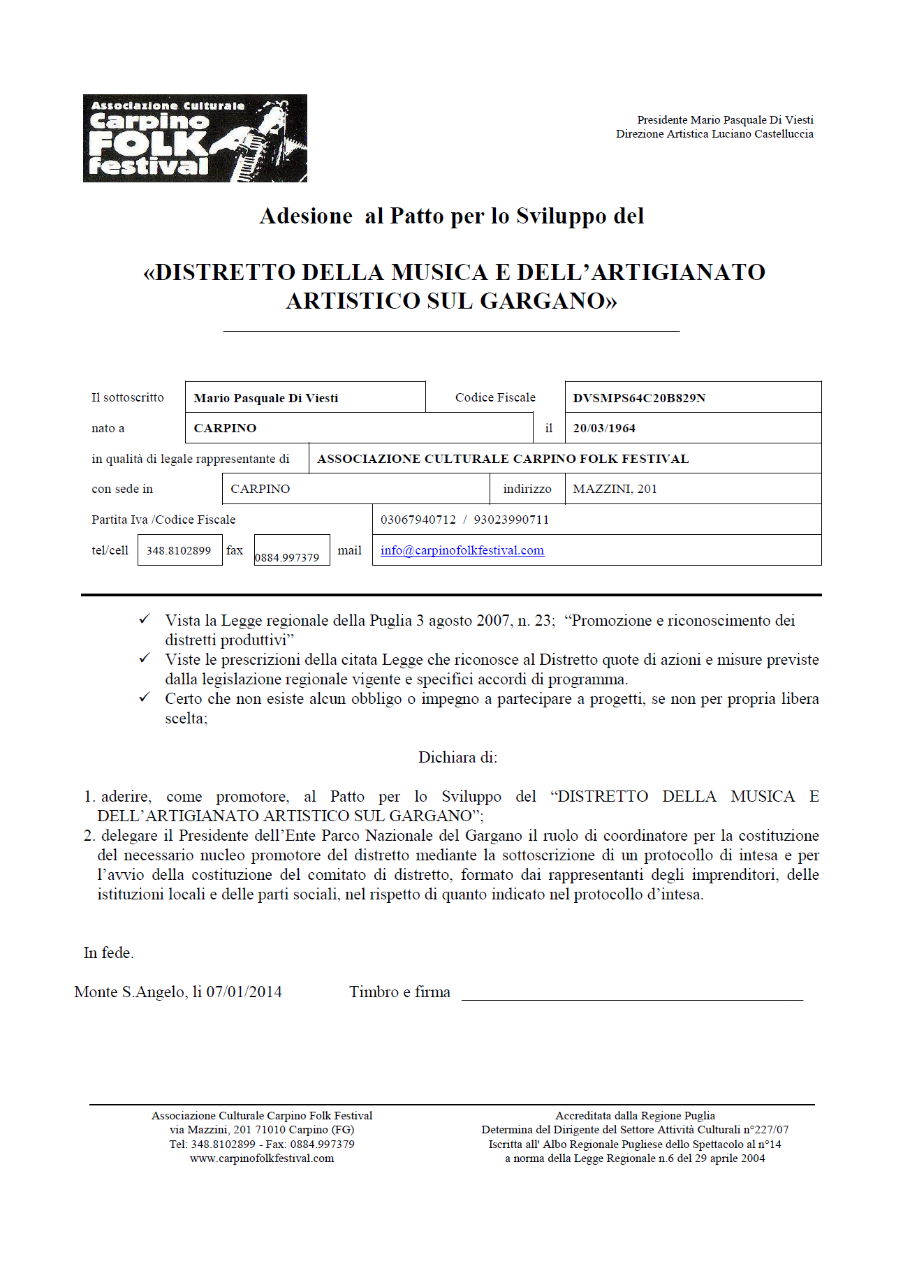 Il sottoscritto Mario Pasquale Di Viesti in qualità di legale rappresentante dell’ASSOCIAZIONE CULTURALE CARPINO FOLK FESTIVAL con sede in CARPINO, via MAZZINI, 201
