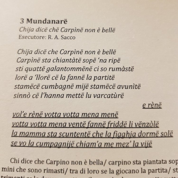 Il sonetto, del repertorio di Rocco Antonio Sacco, è contenuto in “Canti e suoni della tradizione di Carpino“.