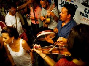 Sento ritmi familiari, tamburelli e corde di chitarra battente pizzicate. Come un segugio mi alzo e “vado a caccia”. Scopro che sono nel mezzo di uno spettacolo, “Cantar viaggiando, una valigia di ricordi”, un viaggio slow intorno al tema dell’emigrazione, e questo non è un treno normale ma il treno che Ferrovie del Gargano ha messo a disposizione del Carpino Folk Festival, una manifestazione “glocale”, partita quasi venti anni fa dalla mente di Rocco Draicchio e consegnata poi nelle mani di alcuni giovani carpinesi che con orgoglio e vivacità hanno fatto sentire la loro voce prima in Puglia, poi in Italia. Ora la tarantella del Gargano è cantata in tutto il mondo, obiettivo riuscito?