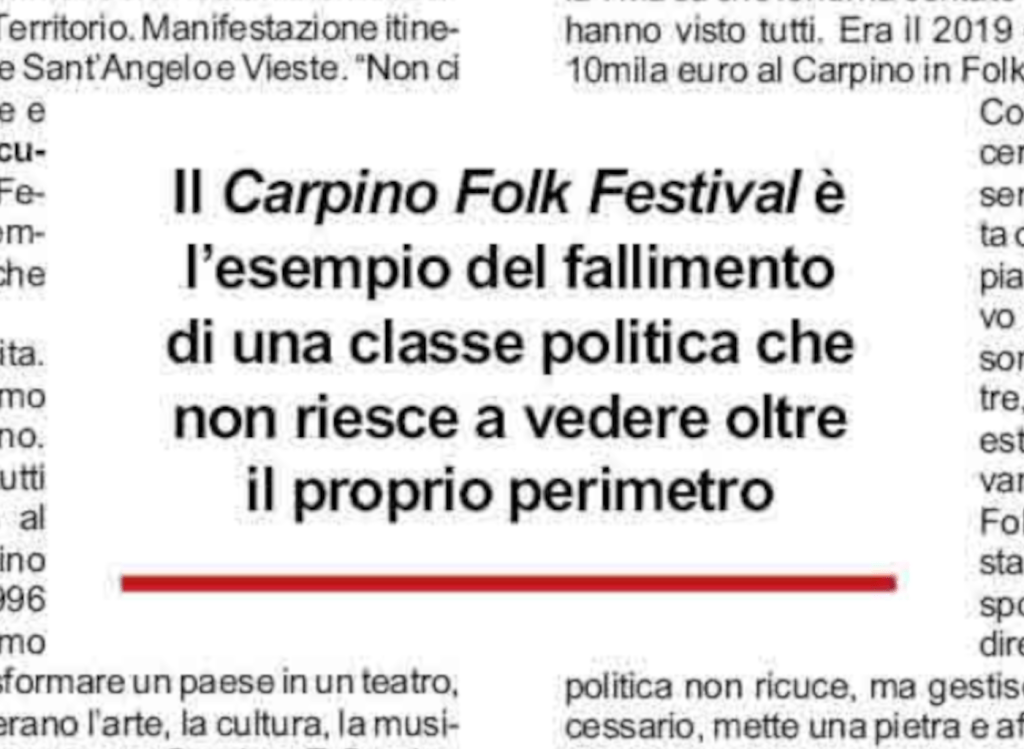 “Piuttosto che niente è meglio piuttosto” dice un detto consolatorio ripetuto più volte negli ultimi periodi, ma il punto però è che non si è partito dal niente, ma piuttosto che sostenere nell’innovazione il Carpino Folk Festival, magari spronandolo a condividere le sue buone pratiche con il resto della comunità, si è deciso di mortificare i temperamenti costruttivi, di dividere e contrapporre gli interessi in gioco e far vincere le dinamiche scoraggianti di paese. Ma chi ne ha pagato le conseguenze se non proprio quelli che si diceva di voler tutelare?